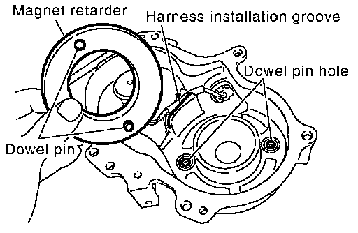 b. Install magnet retarder aligning the dowel pins of the back with the cover side dowel pin holes securely. Simultaneously insert the harness into the installation groove securely.