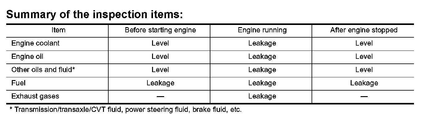 ^ Warm up engine thoroughly to make sure there is no leakage of fuel, exhaust gases, or any oil/fluids including engine oil and engine coolant.