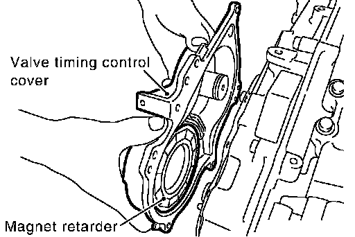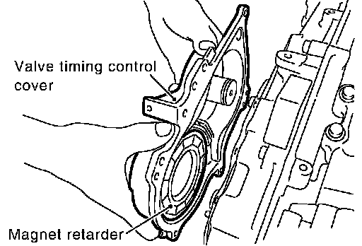 ^ When carrying valve timing control cover, face the magnet retarder side up to prevent the cover from falling from magnet retarder.