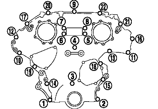 21. Loosen two mounting bolts in front of oil pan (upper) in reverse order as shown in the figure.
