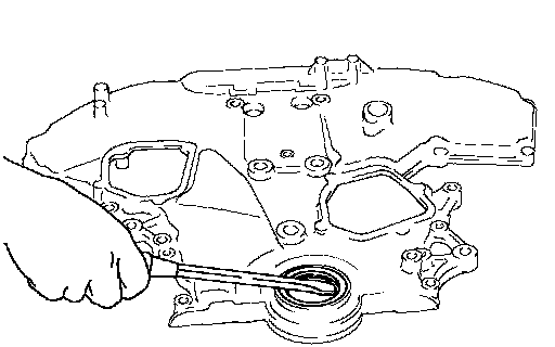 26. Remove front oil seal from front timing chain case using suitable tool.