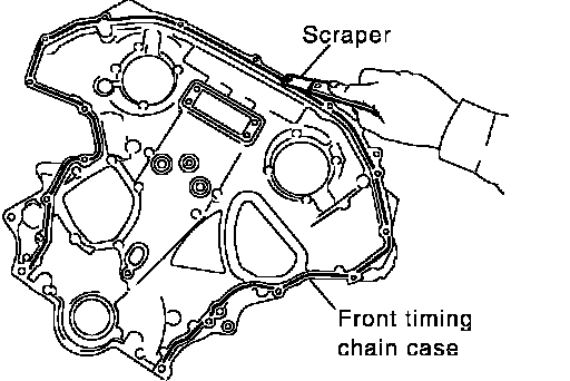 28. Use scraper to remove all traces of old liquid gasket from front and rear timing chain cases and oil pan (upper), and liquid gasket mating surfaces.