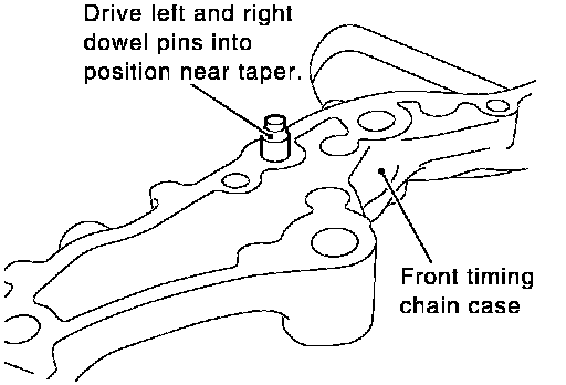 2. Hammer dowel pins (right and left) into front timing chain case up to a point close to taper in order to shorten protrusion length.