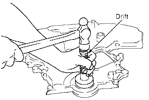 ^ Using suitable drift [outer diameter: 60 mm (2.36 inch)], press-fit oil seal until it becomes flush with front timing chain case end face.