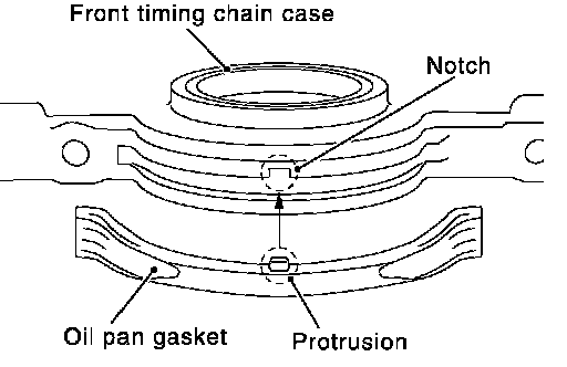 ^ Align notch of front timing chain case with protrusion of oil pan gasket.