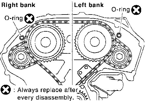 NOTE: If hydraulic pressure inside timing chain tensioner drops after removal/installation, slack in the guide may generate a pounding noise during and just after engine start. However, this is normal. Noise will stop after hydraulic pressure rises.