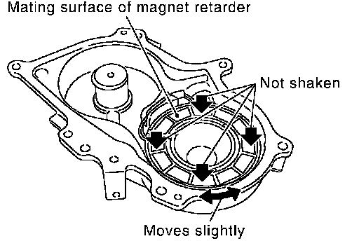 c. To check the joint between dowel pins and dowel pin holes, check the looseness in the axle direction by pushing the mating surface of magnet retarder at several places and the circumferential looseness (between dowel pins and dowel pin holes) by twisting in the circumferential direction.