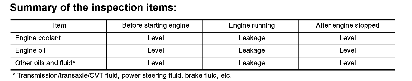 ^ Before starting engine, check oil/fluid levels including engine coolant and engine oil. If less than required quantity, fill to the specified level.