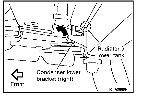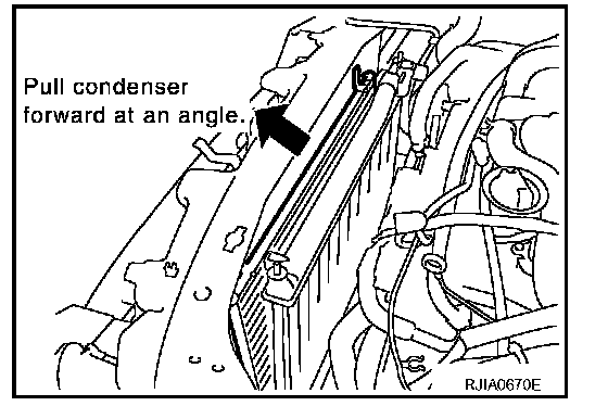 12. Lift condenser up slightly and tilt it toward front of vehicle. (This is because condenser lower bracket is on bottom of radiator tank.)