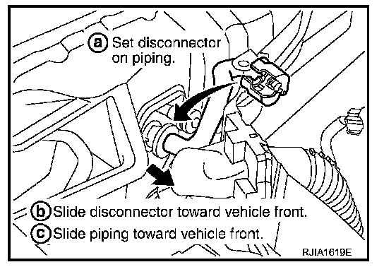 c. Slide A/C piping toward vehicle front and disconnect it.
