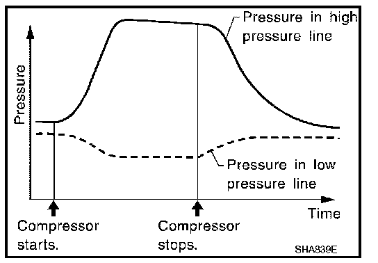 Refrigerant leaks should be checked immediately after stopping the engine. Begin with the leak detector at the compressor. The pressure on the high-pressure side will gradually drop after refrigerant circulation stops and pressure on the low-pressure side will gradually rise, as shown in the graph. Some leaks are more easily detected when pressure is high.