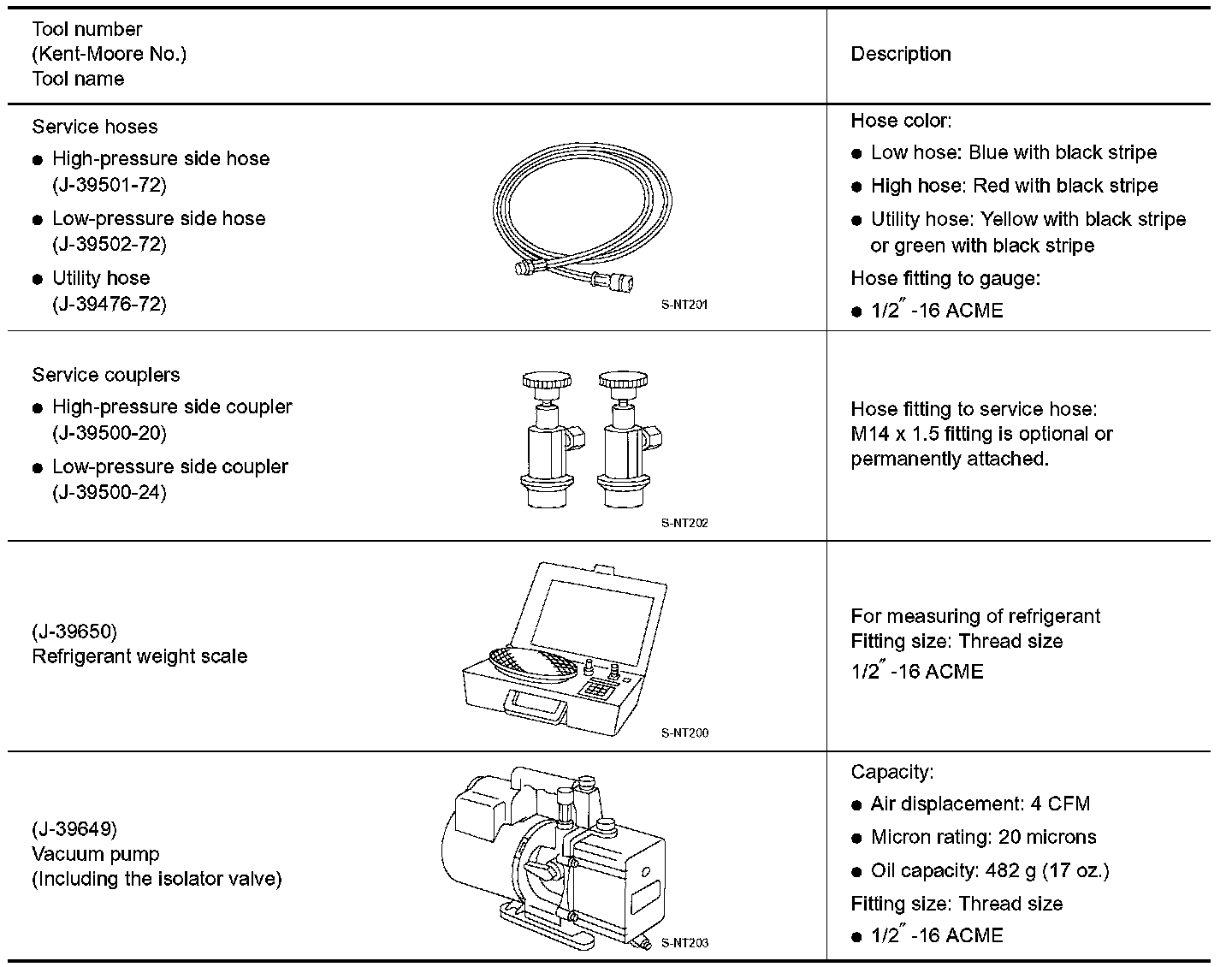 Refrigerant container fittings, service hose fittings and service equipment fittings (equipment which handles refrigerant and/or lubricant) are different between CFC-12 (R-12) and HFC-134a (R-134a). This is to avoid mixed use of the refrigerants/lubricant.