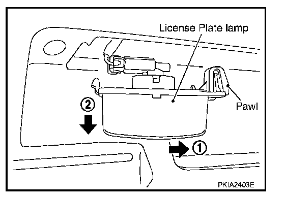 1. While pressing pawl on reverse side, push license plate towards you to remove.