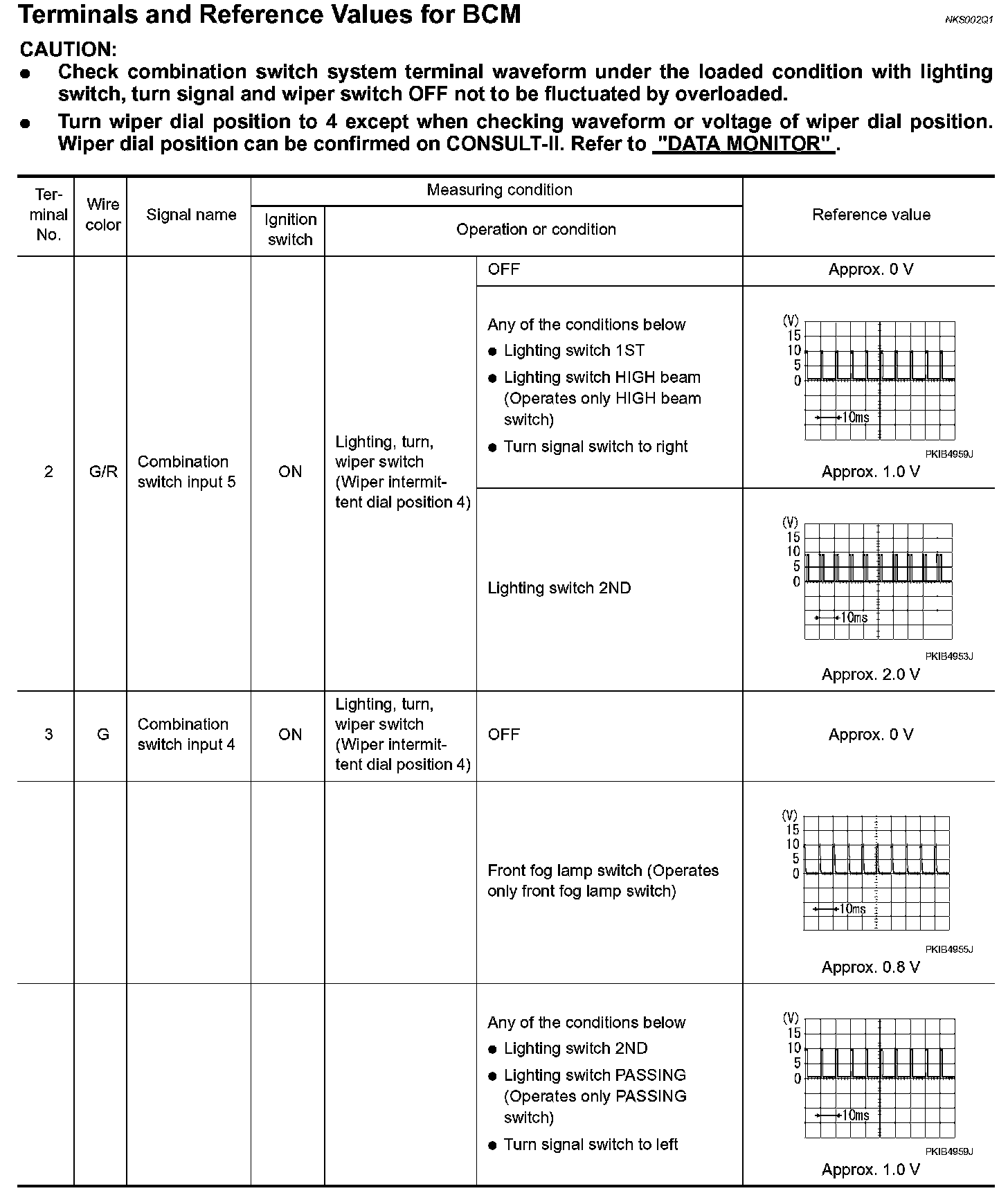 - Turn wiper dial position to 4 except when checking waveform or voltage of wiper dial position. Wiper dial position can be confirmed on CONSULT-II. Refer to "DATA MONITOR".