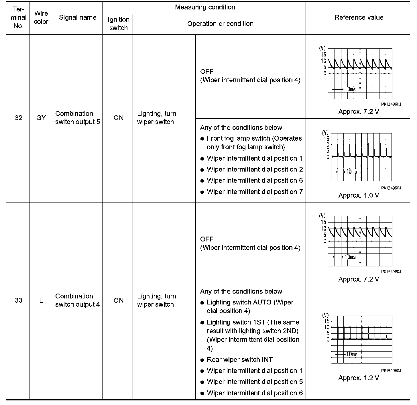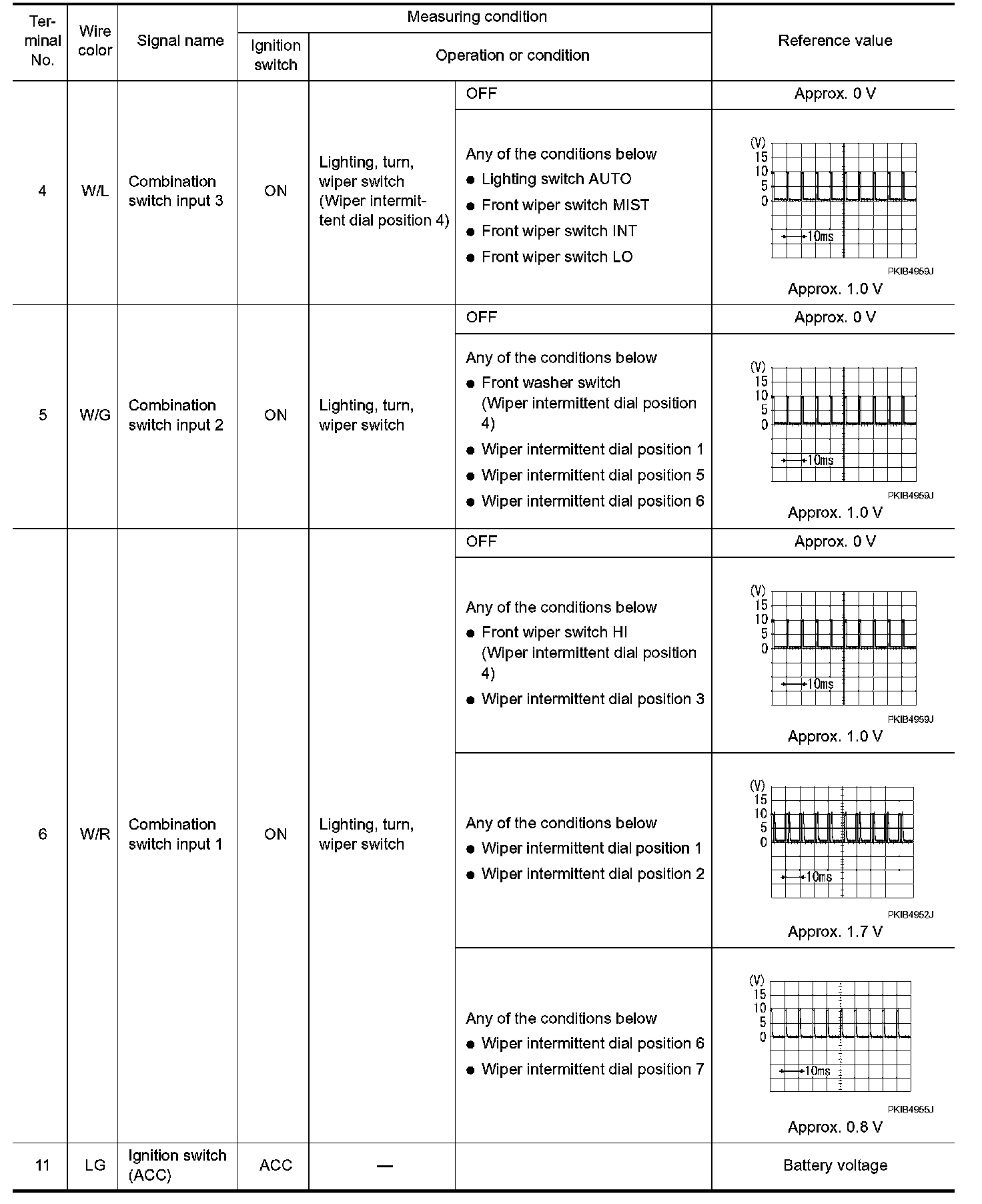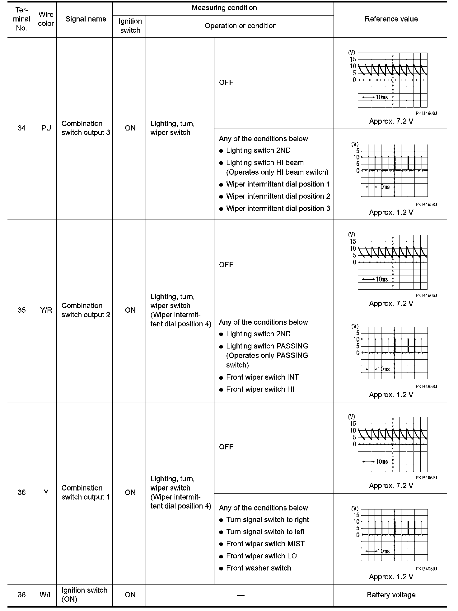 - Check combination switch system terminal waveform under the loaded condition with lighting switch, turn signal and wiper switch OFF not to be fluctuated by overloaded.