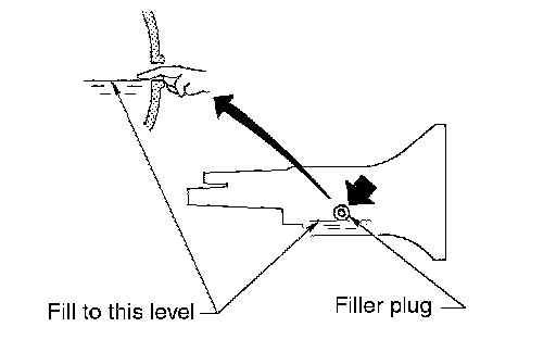 ^ Check oil level from filler plug mounting hole as shown in the figure.