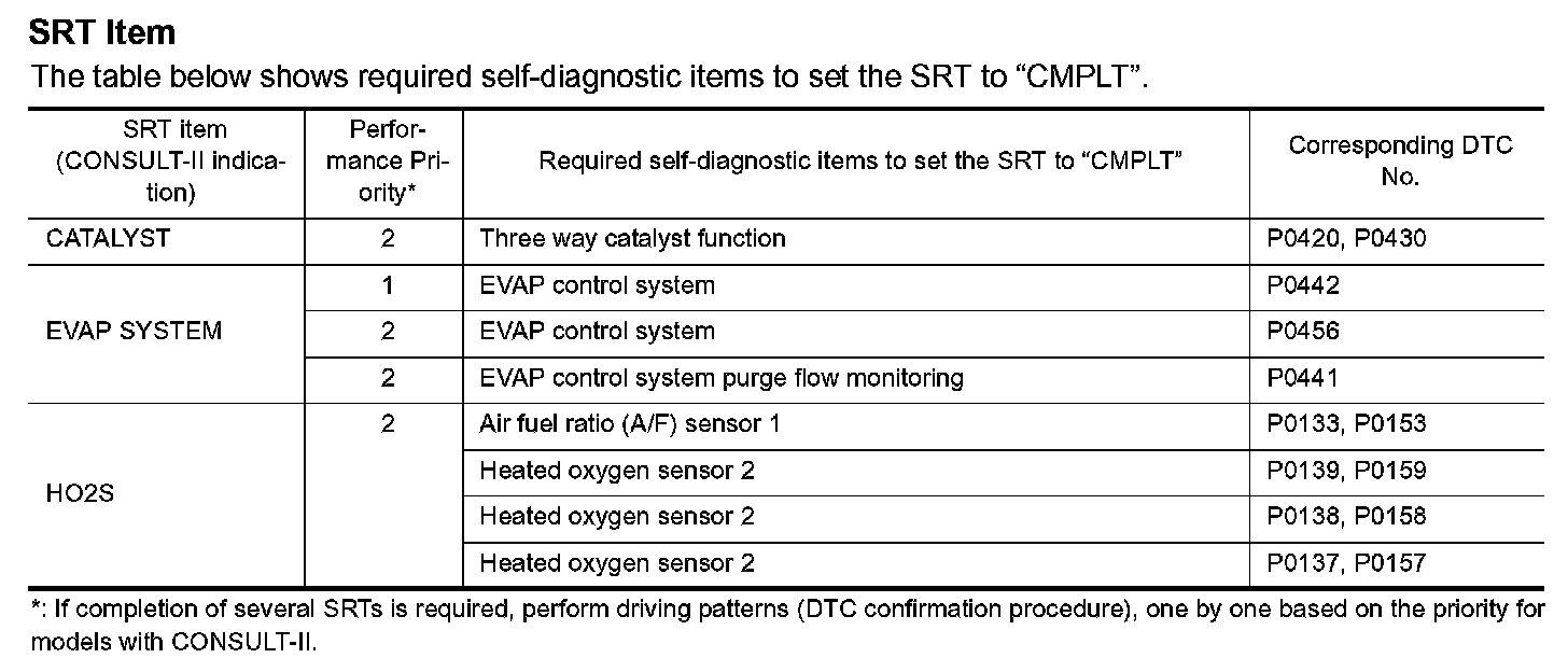 To set all SRT codes, self-diagnosis for the items indicated above must be performed one or more times. Each diagnosis may require a long period of actual driving under various conditions.