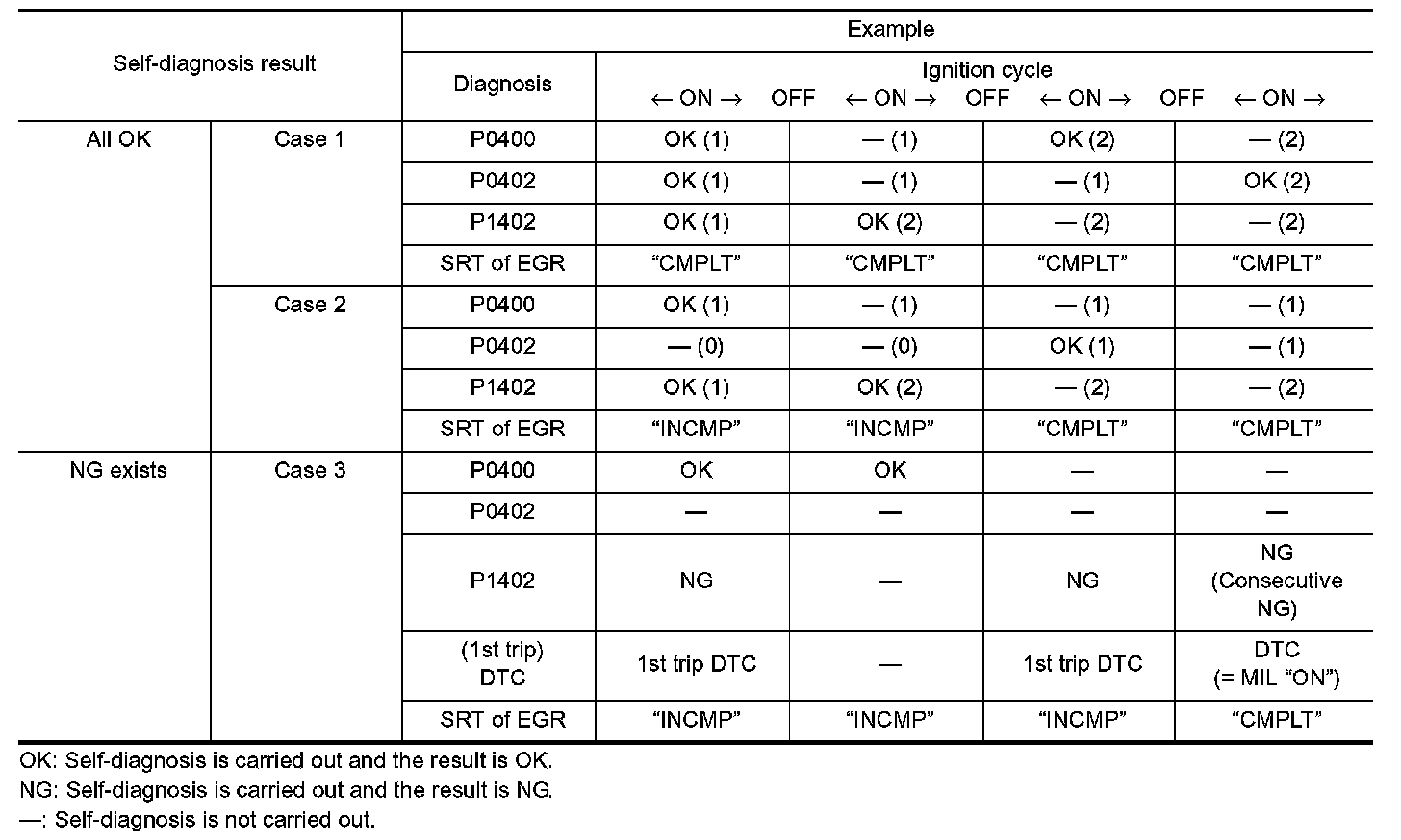 The table above shows that the minimum number of cycles for setting SRT as "INCMP" is one (1) for each self-diagnosis (Case 1 & 2) or two (2) for one of self-diagnosis (Case 3). However, in preparation for the state emissions inspection, it is unnecessary for each self-diagnosis to be executed twice (Case 3) for the following reasons: