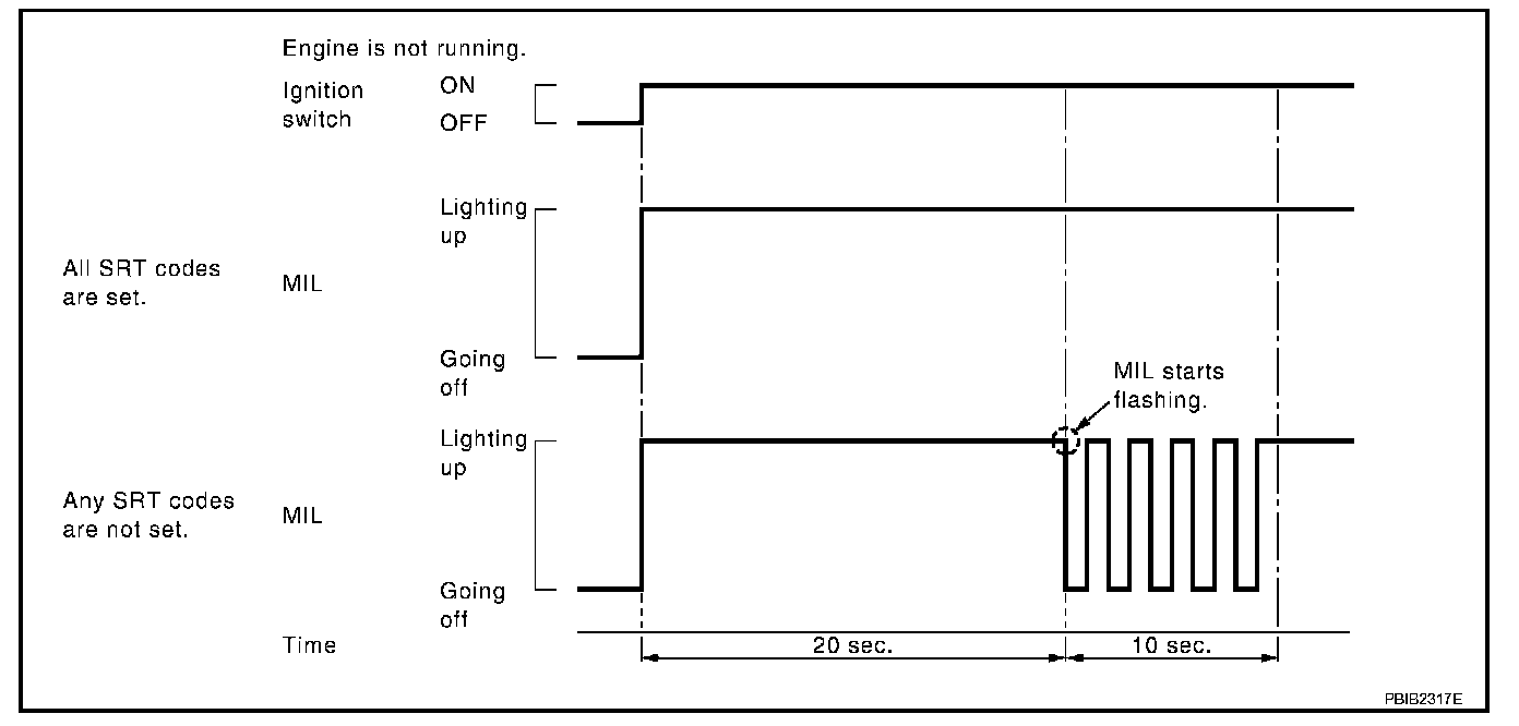 - When any SRT codes are not set, MIL will flash periodically for 10 seconds.