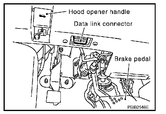 2. Connect CONSULT-II and CONSULT-II CONVERTER to data link connector, which is located under LH dash panel near the hood opener handle.