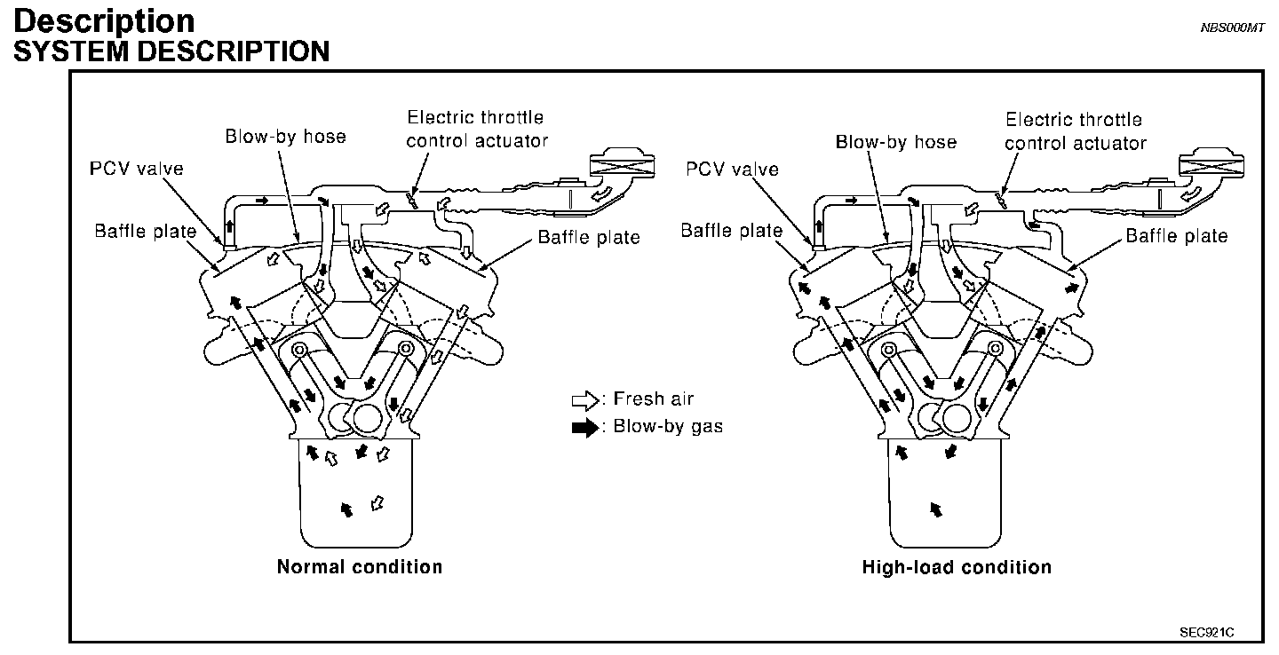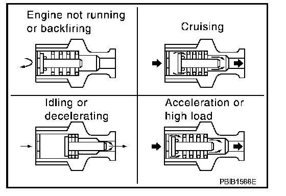 The positive crankcase ventilation (PCV) valve is provided to conduct crankcase blow-by gas to the intake manifold. During partial throttle operation of the engine, the intake manifold sucks the blow-by gas through the PCV valve. Normally, the capacity of the valve is sufficient to handle any blow-by and a small amount of ventilating air. The ventilating air is then drawn from the air inlet tubes into the crankcase. In this process the air passes through the hose connecting air inlet tubes to rocker cover. Under full-throttle condition, the manifold vacuum is insufficient to draw the blow-by flow through the valve. The flow goes through the hose connection in the reverse direction.