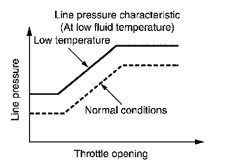 When the A/T fluid temperature drops below the prescribed temperature, in order to speed up the action of each friction element, the line pressure is set higher than the normal line pressure characteristic.