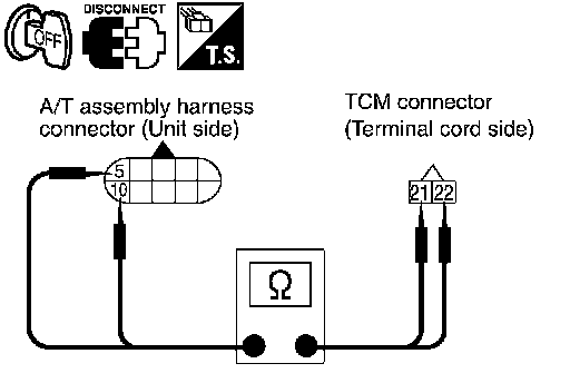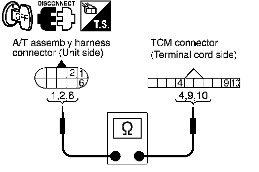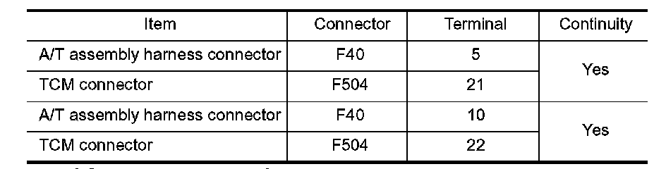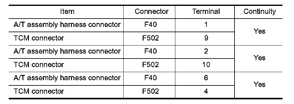 4. Check continuity between A/T assembly harness connector terminals and TCM connector terminals.