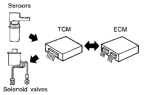 The TCM also communicates with the ECM by means of a signal sent from sensing elements used with the OBD-related parts of the A/T system for malfunction-diagnostic purposes. The TCM is capable of diagnosing malfunctioning parts while the ECM can store malfunctions in its memory.