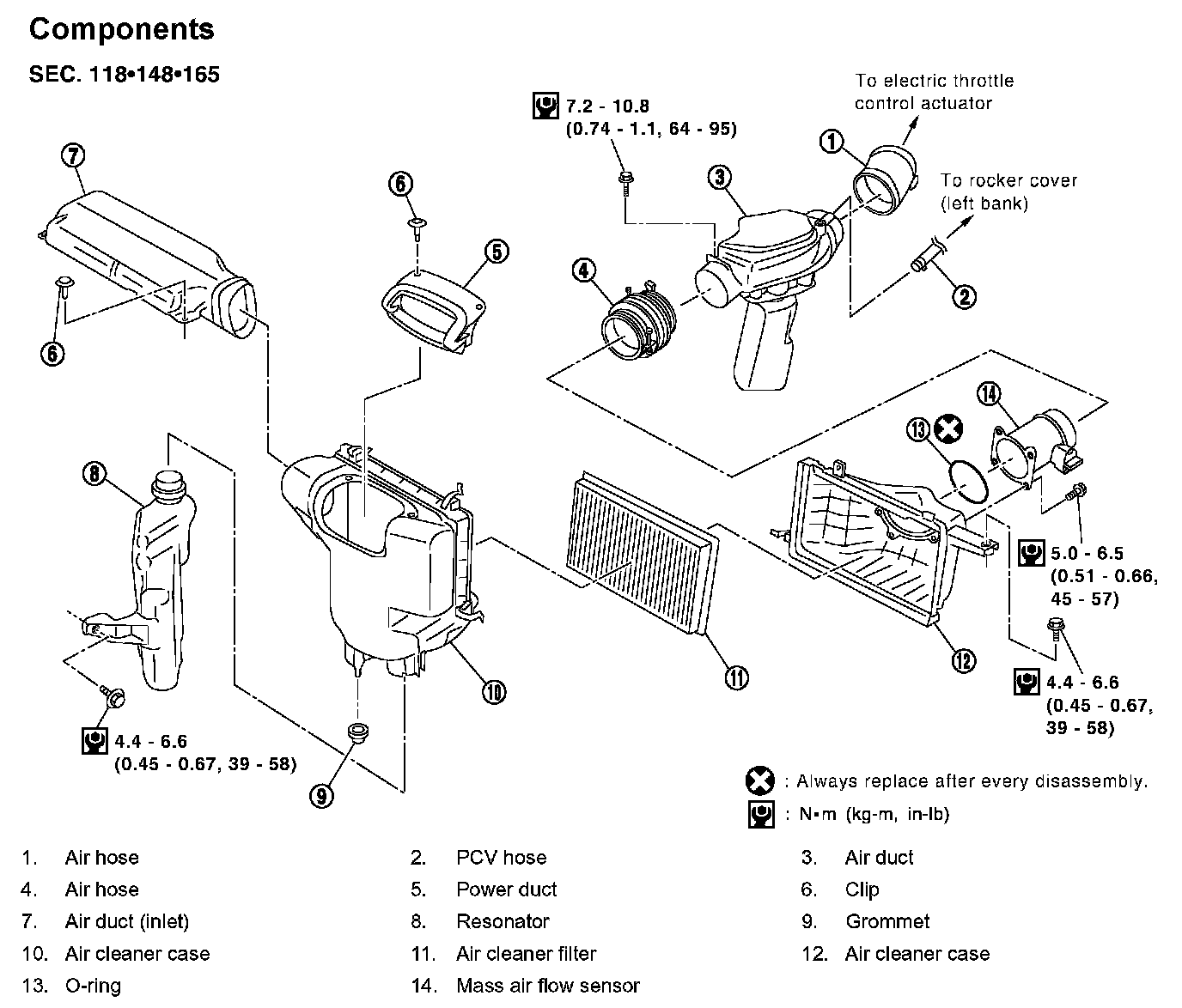 5. Remove air cleaner case/mass air flow sensor assembly and air duct disconnecting their joints.