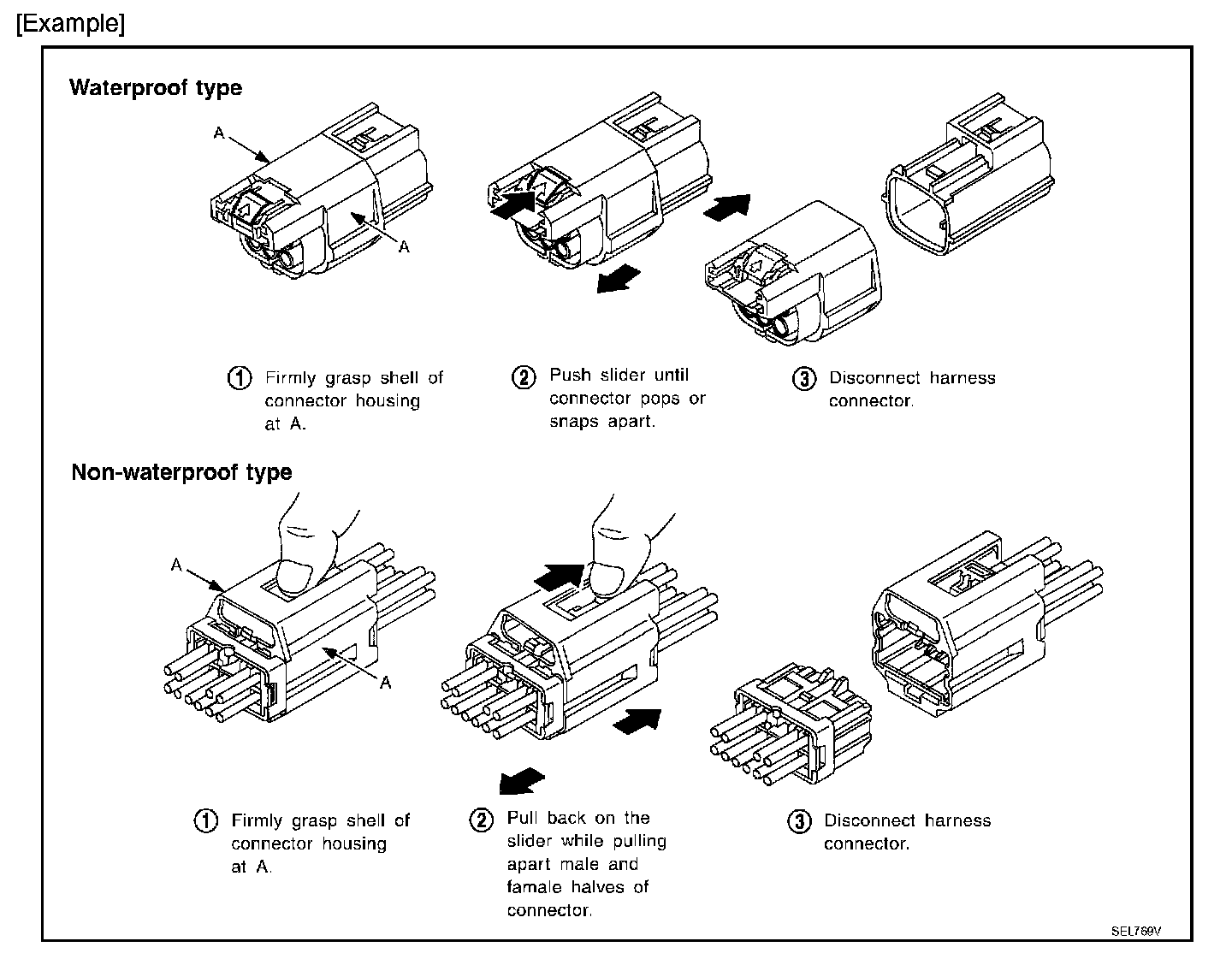 - Never pull the harness or wires when disconnecting the connector.