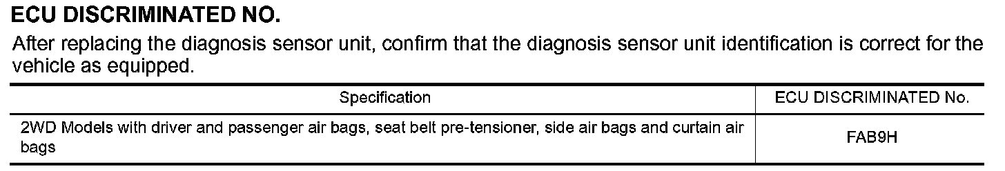 - After replacement of diagnosis sensor unit, perform self-diagnosis to make sure that no malfunction is detected. Refer to SRS-20, "SRS Operation Check".