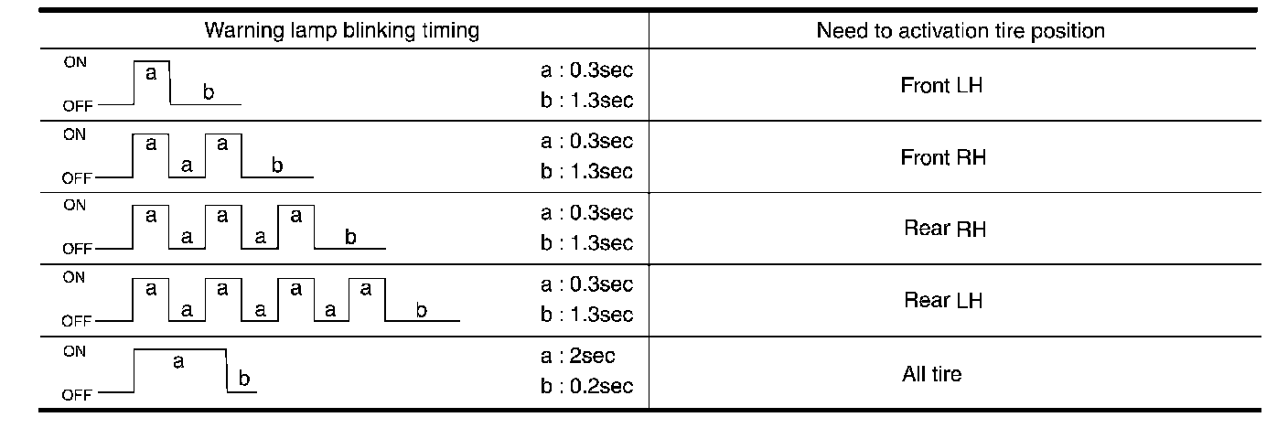 ^ When ignition switch ON, as the low tire pressure warning lamp blinks per the follow diagram, the respective transmitter then must be woken up.