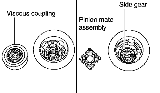 15. Separate differential case A and B, then remove viscous coupling, pinion mate gear, pinion mate thrust washer, side gear and side gear thrust washer from differential cases.