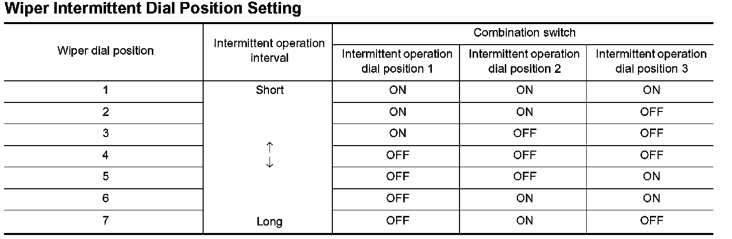 When combination switch status is as listed below, BCM determines that it is wiper Intermittent dial position 1.