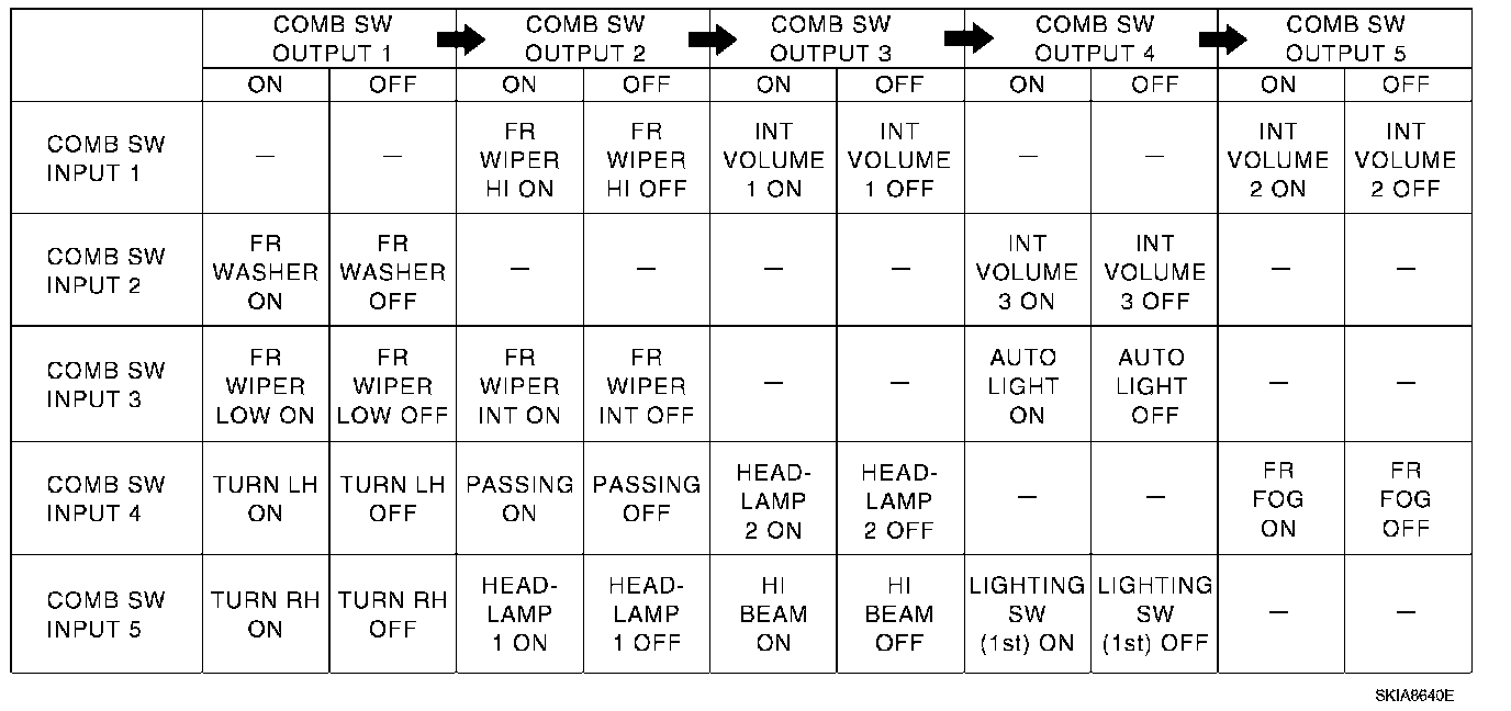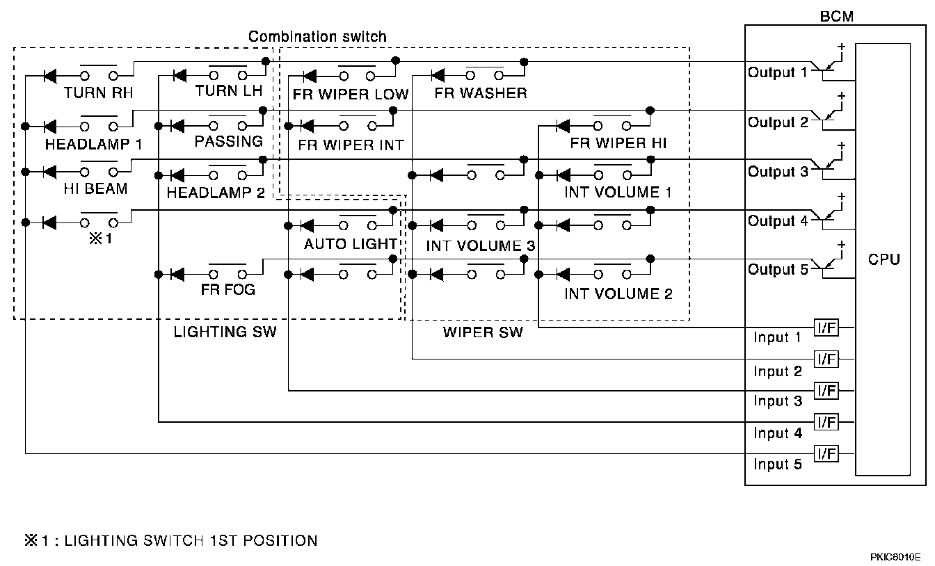 - Wiper switch (combination switch) is composed of a combination of 5 output terminals and 5 input terminals. Terminal combination status is read by BCM (body control module) when switch is turned ON.