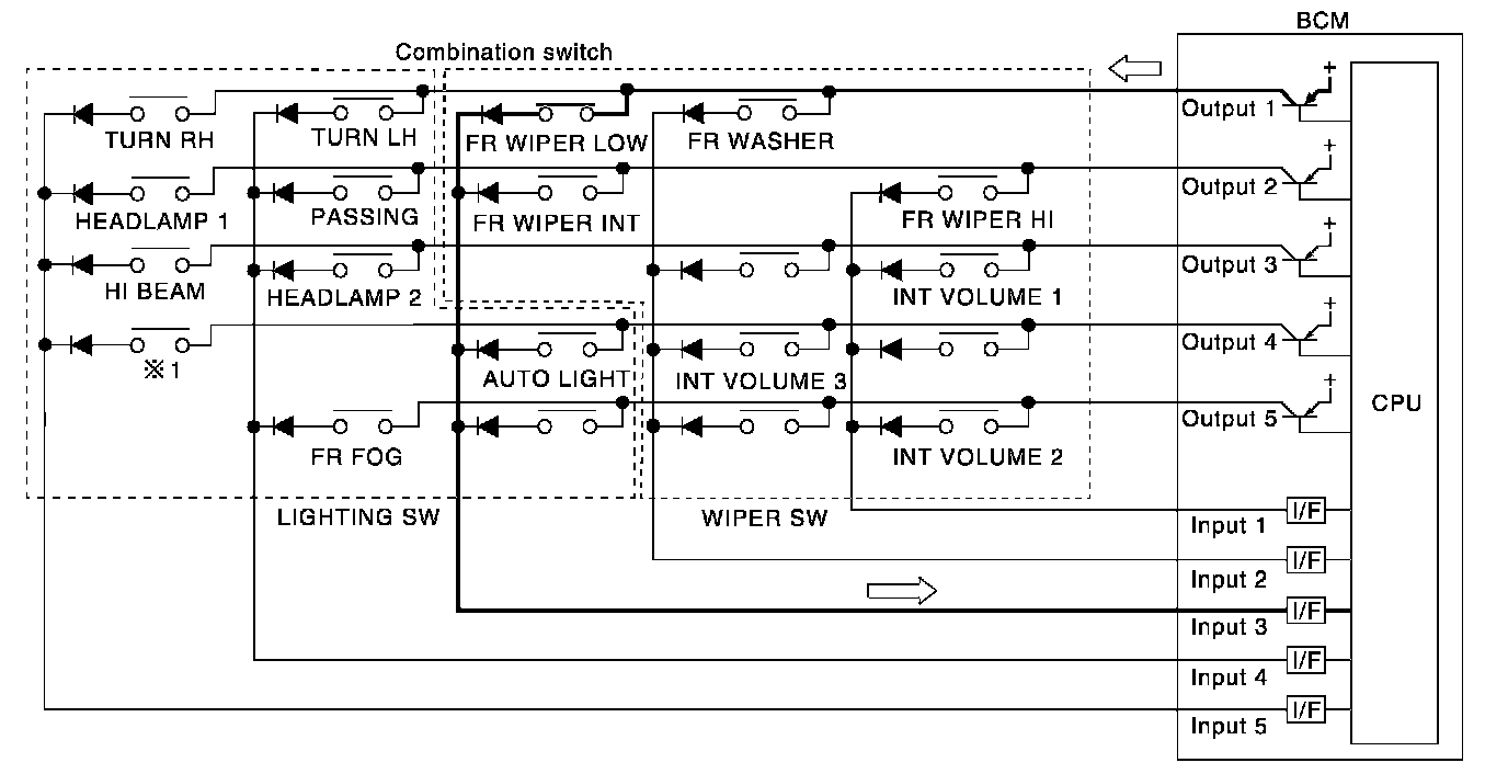 - If BCM detects that voltage changes in INPUT 3 when OUTPUT 1 transistor is activated again, it recognizes that wiper switch is still in LOW position.