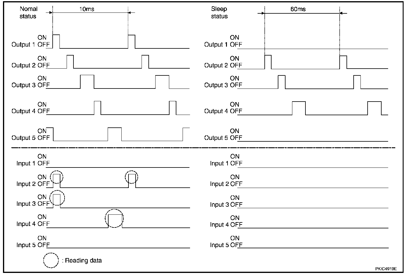 - When BCM is in sleep status, transistors of OUTPUT (1 and 5) stop the output, and BCM enters low current consumption mode. OUTPUT (2, 3, and 4) turn ON-OFF every 60 ms, and only input from light switch system is accepted.