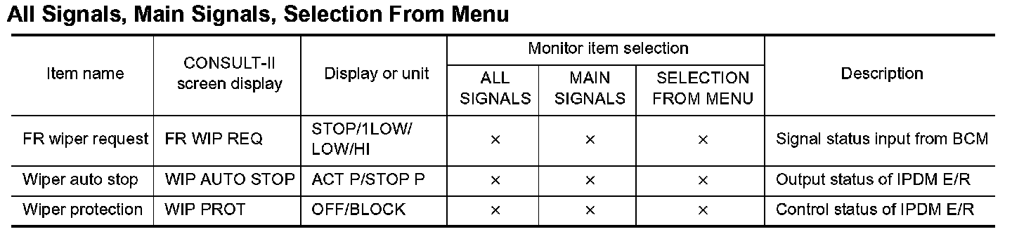 NOTE: Perform monitoring of IPDM E/R data with ignition switch ON. When ignition switch is at ACC, the display may not be correct.