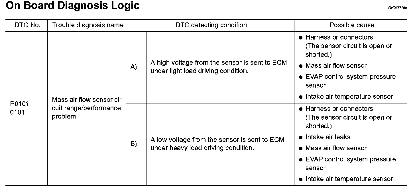 a. Check for the cause of uneven air flow through mass air flow sensor. Refer to following.