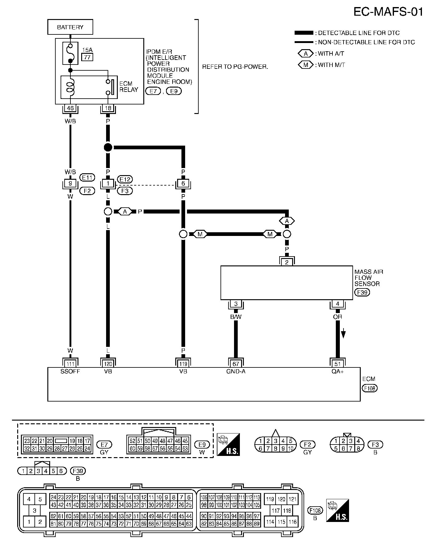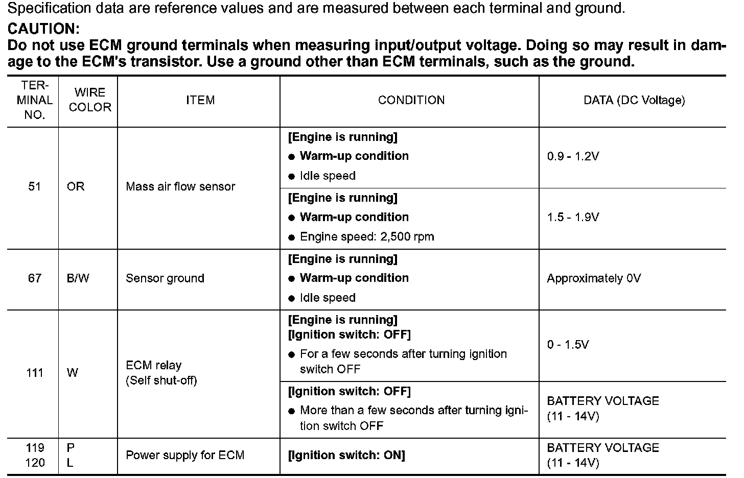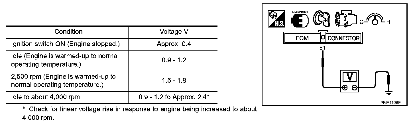 3. Check voltage between ECM terminal 51 (Mass air flow sensor signal) and ground.