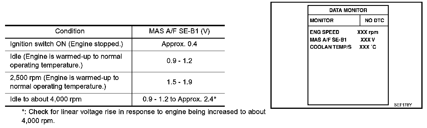 4. Check the voltage of "MAS A/F SE-B1" with "DATA MONITOR".