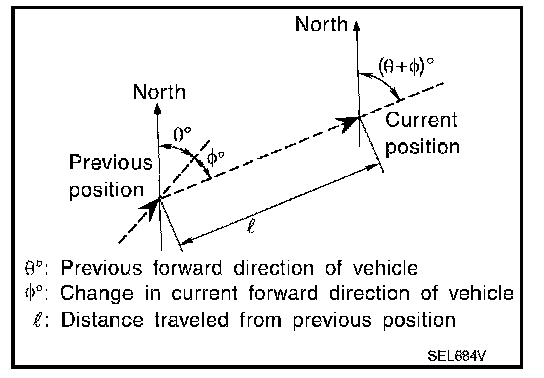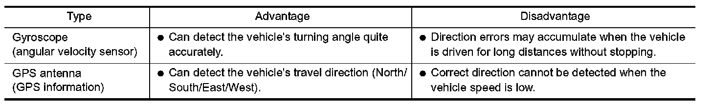 The navigation system periodically calculates the vehicle's current position according to the following three signals: Travel distance of the vehicle as determined by the vehicle speed sensor, turning angle of the vehicle as determined by the gyroscope (angular velocity sensor), and the direction of vehicle travel as determined by the GPS antenna (GPS information).