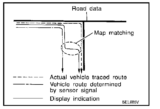 Map-matching is a function that repositions the vehicle on the road map when a new location is judged to be the most accurate. This is done by comparing the current vehicle position, calculated by the method described in the position detection principle, with the road map data around the vehicle, read from the map DVD-ROM stored in the DVD-ROM drive.