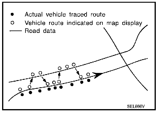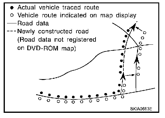 - Map-matching does not function correctly when the road on which the vehicle is driving is new and not recorded in the map DVD-ROM, or when the road pattern stored in the map data and the actual road pattern are different due to repair.