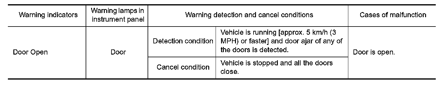 When combination meter receives warning signal from door switch, combination meter warning lamp is illuminated.