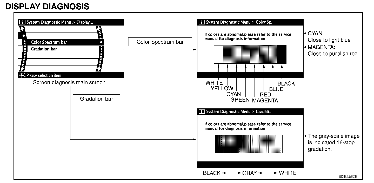If RGB signal is malfunctioning, the tint of the color bar display is as follows.