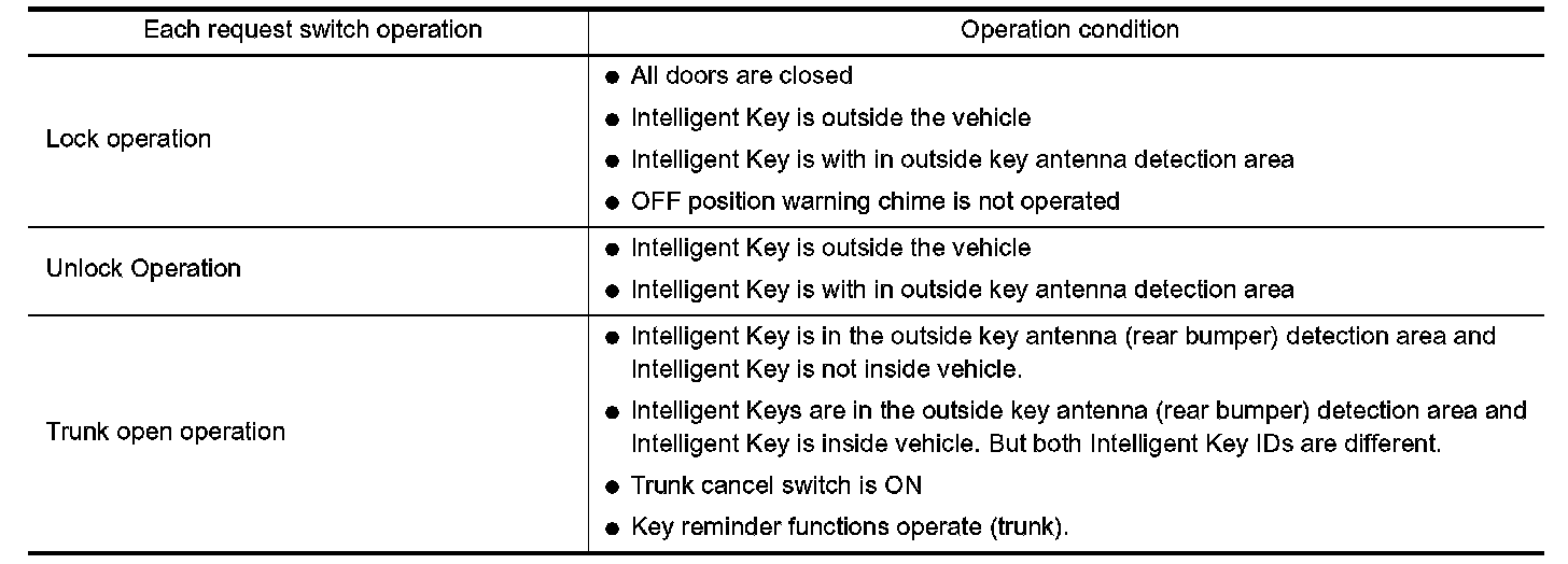 If the following conditions are not satisfied, door lock/unlock or trunk open operations are not performed even if the request switch is operated.