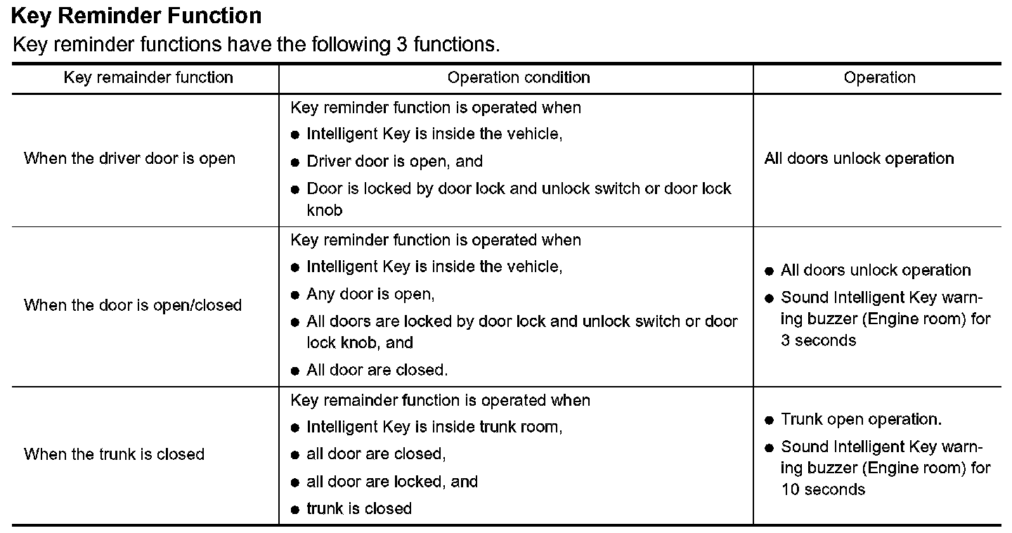 - The Intelligent Key system is a system that makes it possible to lock and unlock the door locks (door lock/ unlock function), open the trunk (trunk open function), and start the engine (engine start function) by carrying around the Intelligent Key (without some key operation), which operates based on the results of electronic ID verification using two-way communications between the Intelligent Key and the vehicle (Intelligent Key unit).