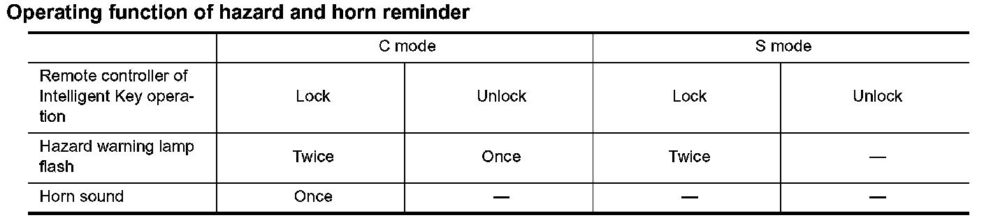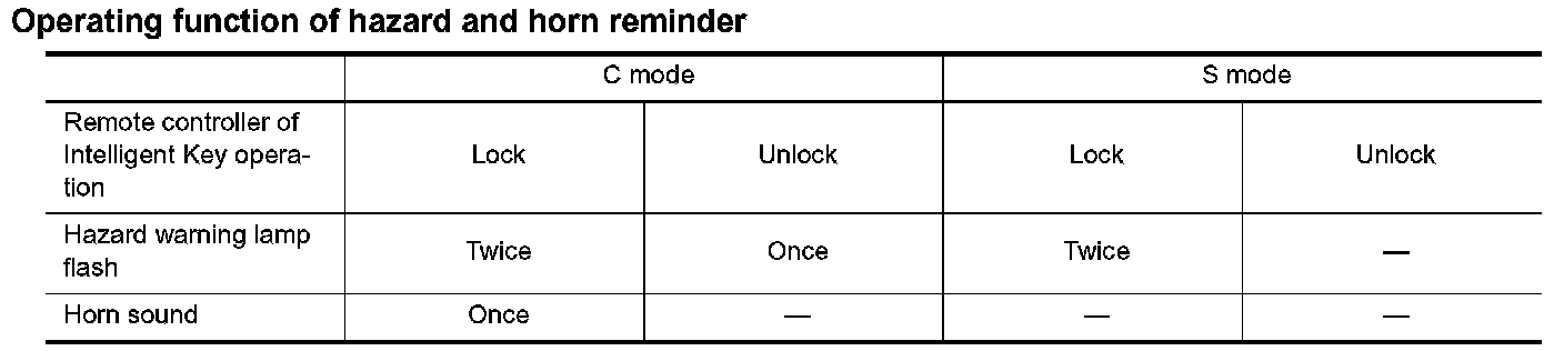 When LOCK and UNLOCK signals are sent from the remote controller of Intelligent Key for more than 2 seconds at the same time, the hazard and horn reminder mode is changed and hazard warning lamp flashes and horn sounds as follows: