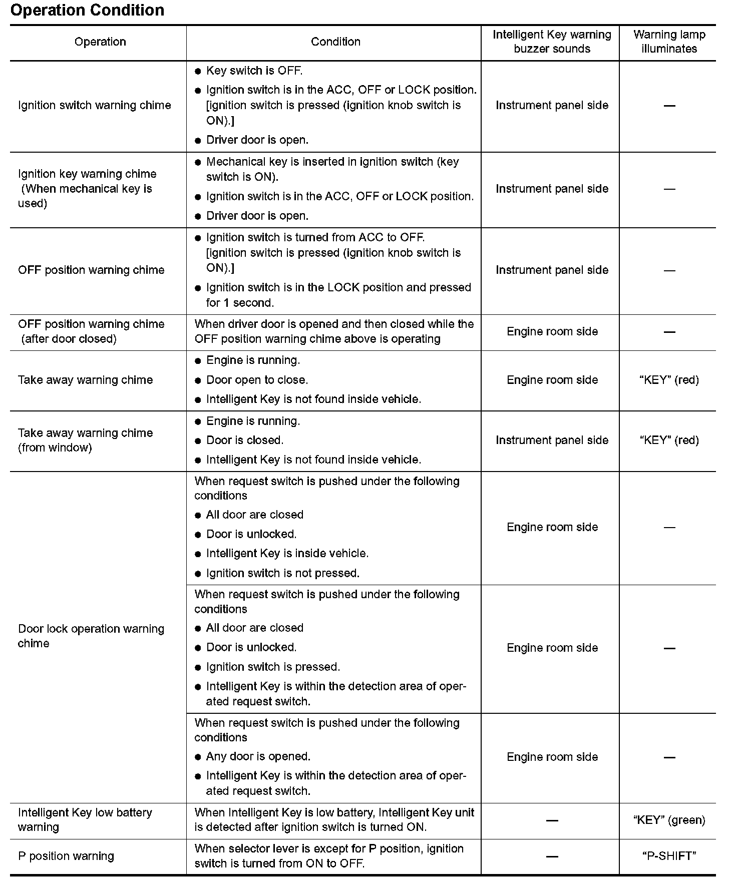 The warning chimes are as follows and are given to the user as warning information and warnings using combinations of Intelligent Key warning buzzer (in instrument panel and engine room), and warning lamps "KEY" and "P-SHIFT".
